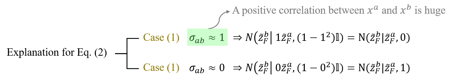 \( \quad \quad \Rightarrow \) \( \widetilde{z}^b_F \sim N (\widetilde{z}^b_F | \sigma_{ab} \widetilde{z}^a_F , (1- \sigma_{ab} ) \mathbf{1} ) \quad \cdots Eq. (2) \)
