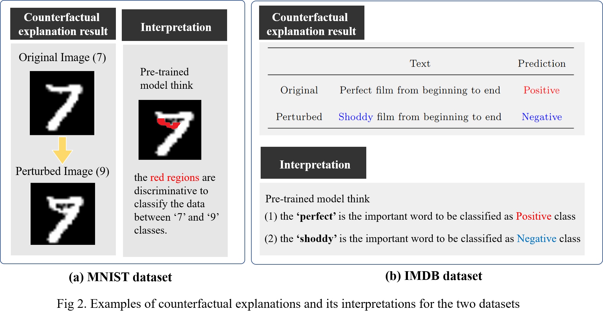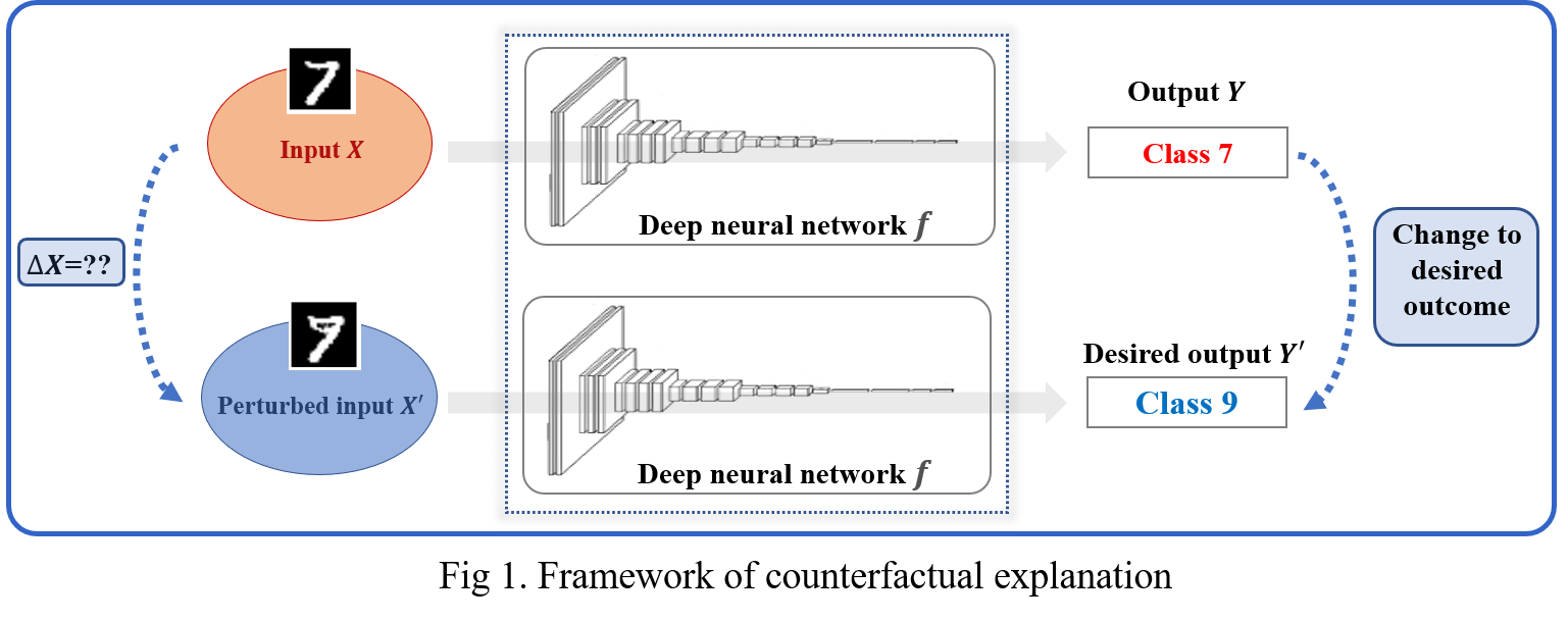 Counterfactual Explanation: Given input data that are classified as a class from a deep network, it is to perturb the subset of features in the input data such that the model is forced to predict the perturbed data as a target class.