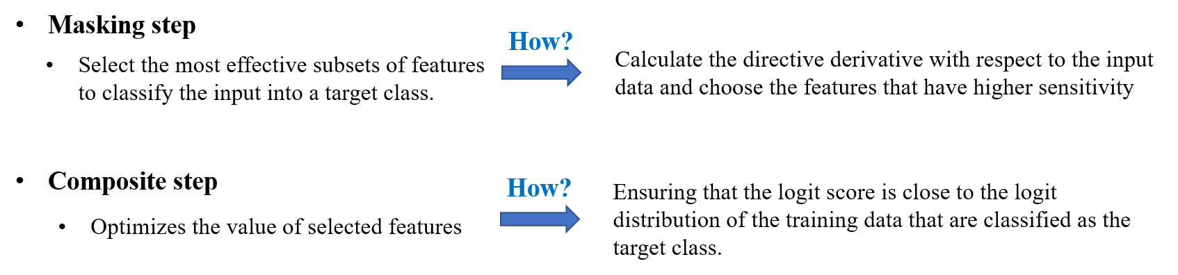 After selecting the input feature to be modified, the composition step optimizes the feature value to ensure that the deep network classifies the perturbed data \(X'\) as the target class \(c_t\). To achieve this, the conventional approaches have proposed an objective function to improve the output score of \(c_t\) as follow: