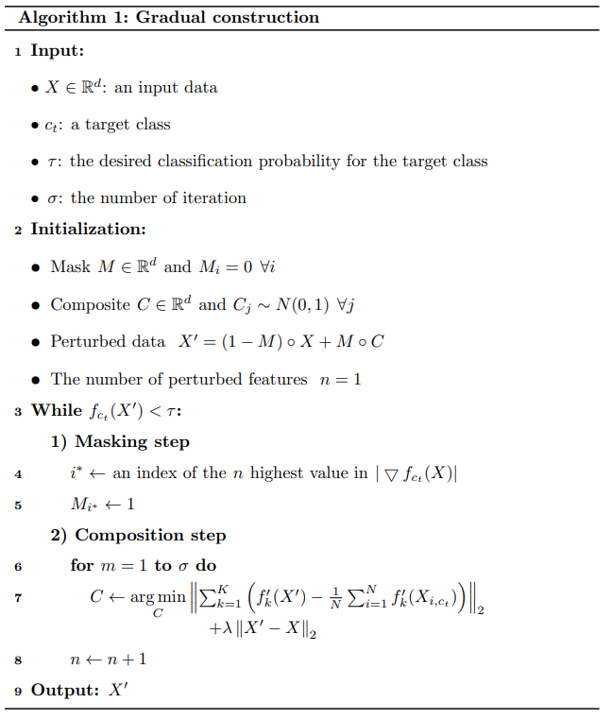 To produce perturbed data \(X'\) whose prediction will be a target class \(c_t\), we progressively search for an optimal mask and a composite. To this end, our method builds gradual construction that iterates over the masking and composition steps until the desired classification score \(\tau\) is obtained.