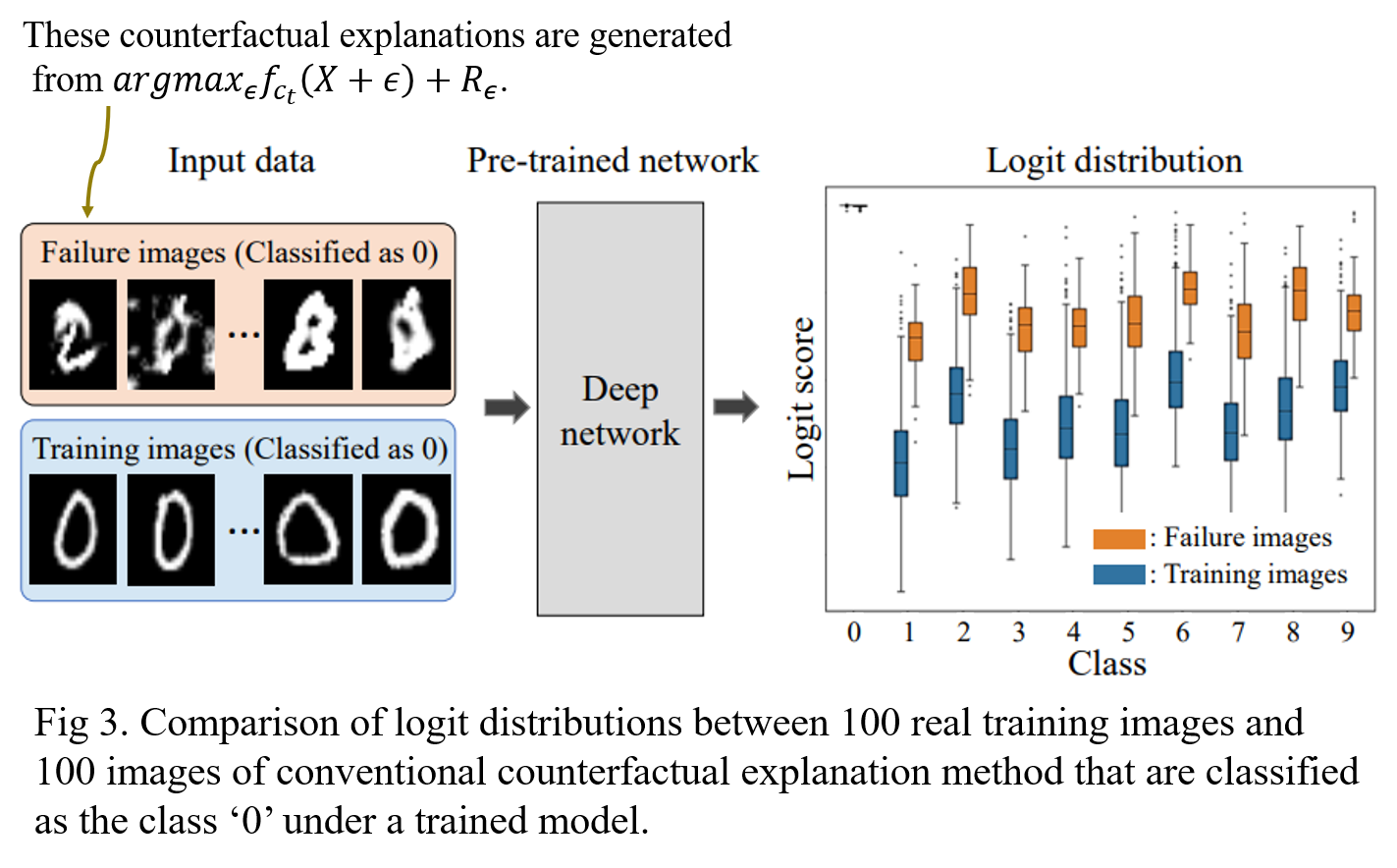 However, this objective function causes an adversarial attack such as Failure images in Fig. 3. Then, we compared the contributions of logit scores (before the softmax layer) for each failure case and the training images that are classified as \(c_t\) from a pre-trained network. And, we discovered that there exists a notable difference between the two distributions as depicted in Fig 3.