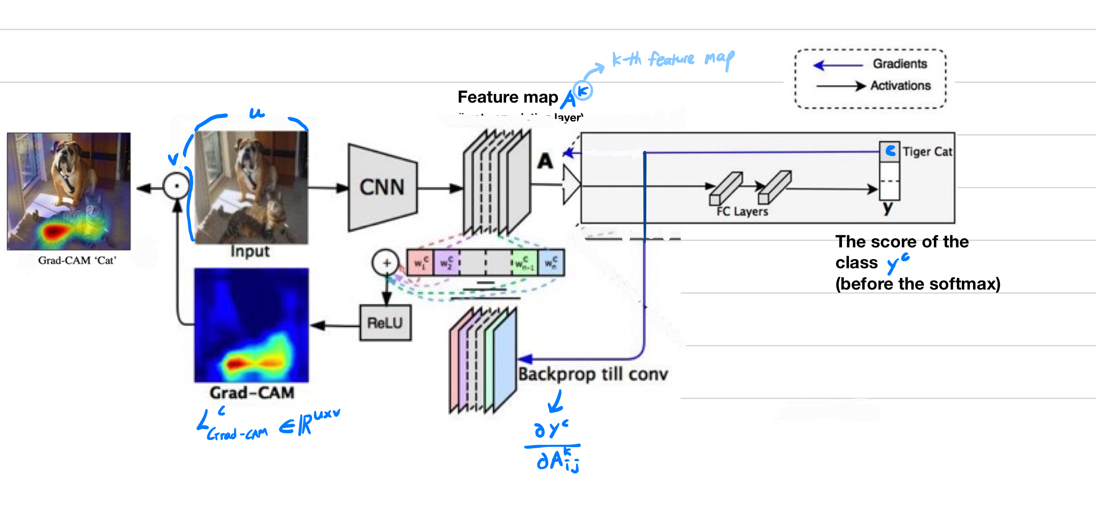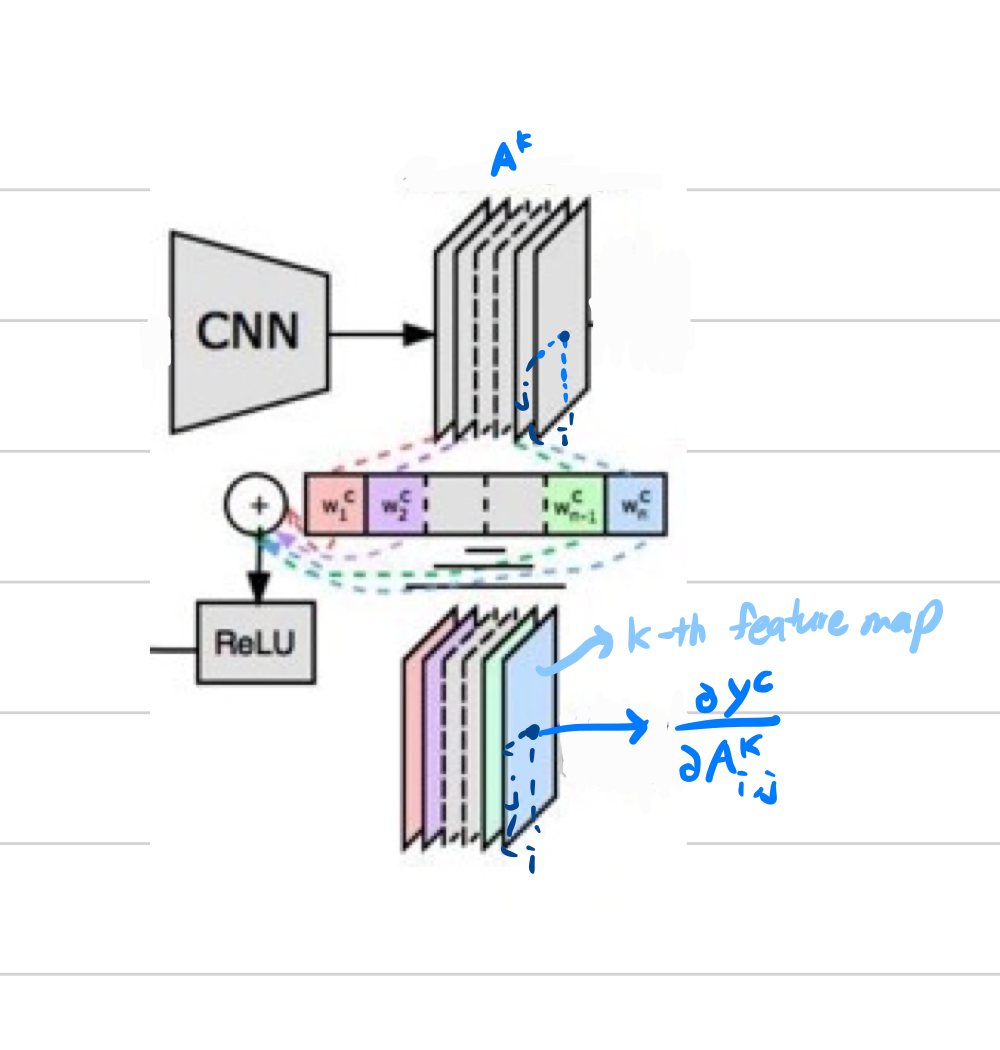 \[\text{Grad-CAM} \quad L^c=ReLu(\sum_k w^c_k A^k) \quad \quad \cdots Eq.(1)\]