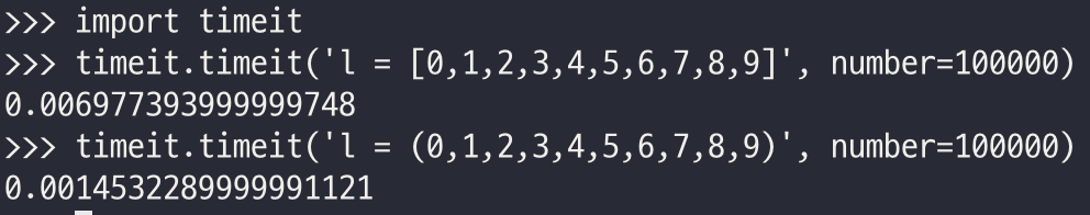 timeit모듈은 작은 python code의 execution time을 측정하는 것입니다. 위 그림으로부터 List와 Tuple의 할당을 100,000번 실행한 결과를 볼 수 있습니다. List는 100,000번 운영체제에서 새롭게 메모리를 할당받아 실행하고 해제하는 것을 반복하지만 Tuple은 한번 메모리를 할당하고 해제하지 않기 때문에 바로 캐싱을 통해 메모리를 재사용합니다. 그래서 속도 차이를 보면 Tuple이 List보다 약 6배 빠른 것을 볼 수 있습니다.