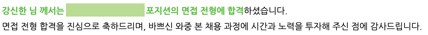 2차 면접에서 기술+인성 질문에 대해 답변을 자연스럽게 잘 하였다고 생각하였고 2~3일 뒤에 아래와 같이 합격 소식을 듣게 되었습니다. (2차 면접합격은 메일로 합격메일이 오기전에 인사 담당자 분이 전화가 오시더라고여..ㅎㅎ)