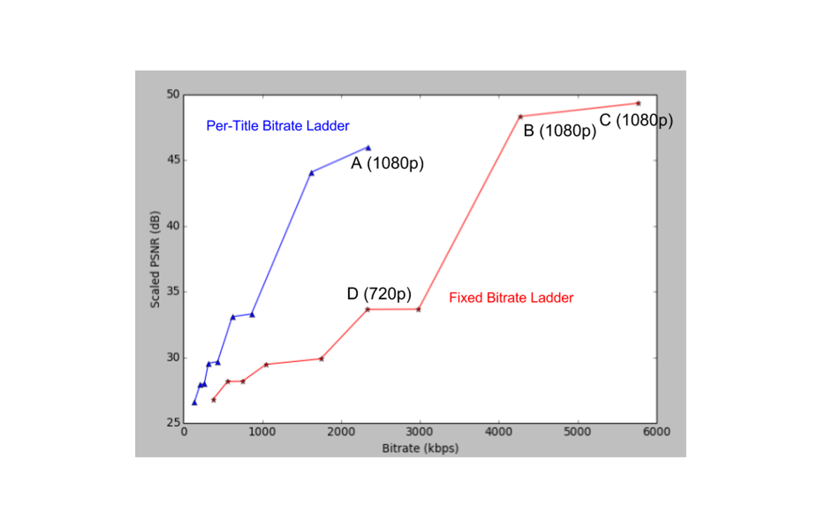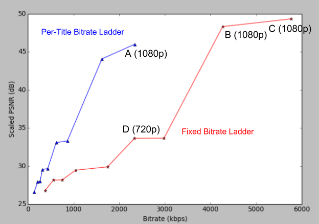1920x1080 resolution기준으로 per-title encoding의 A는 2350 kbps로 encoding했을때 PSNR가 46정도로 high visual quality를 가지지만 fixed QP encoding의 B나 C는 A보다 bitrate는 훨씬 높지만 비슷한 visual quality을 가집니다. 또한 A와 D를 비교했을 때 fixed QP encoding의 D는 A와 비슷한 bitrate를 가지지만 PSNR점수가 훨씬 낮으므로 per-title encoding이 fixed QP encoding보다 좋은 성능을 내었음을 알수 있습니다.