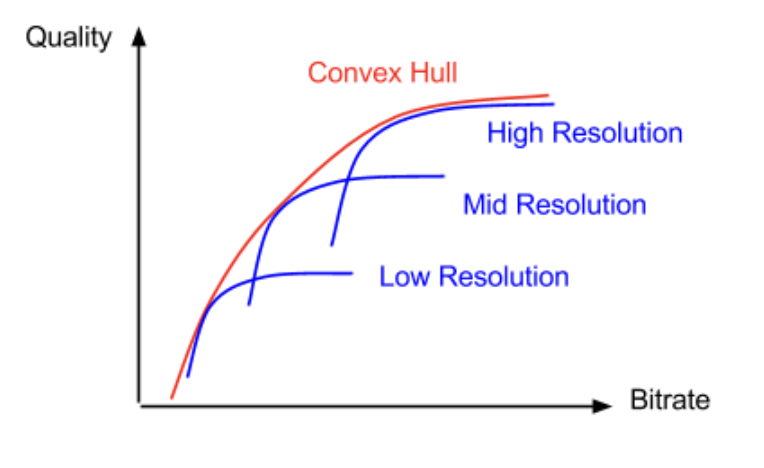 - bitrate-quality relationship그래프에서 각 candidate resolution마다 convex hull에 근접한 point들을 골라 bitrate ladder를 구성함