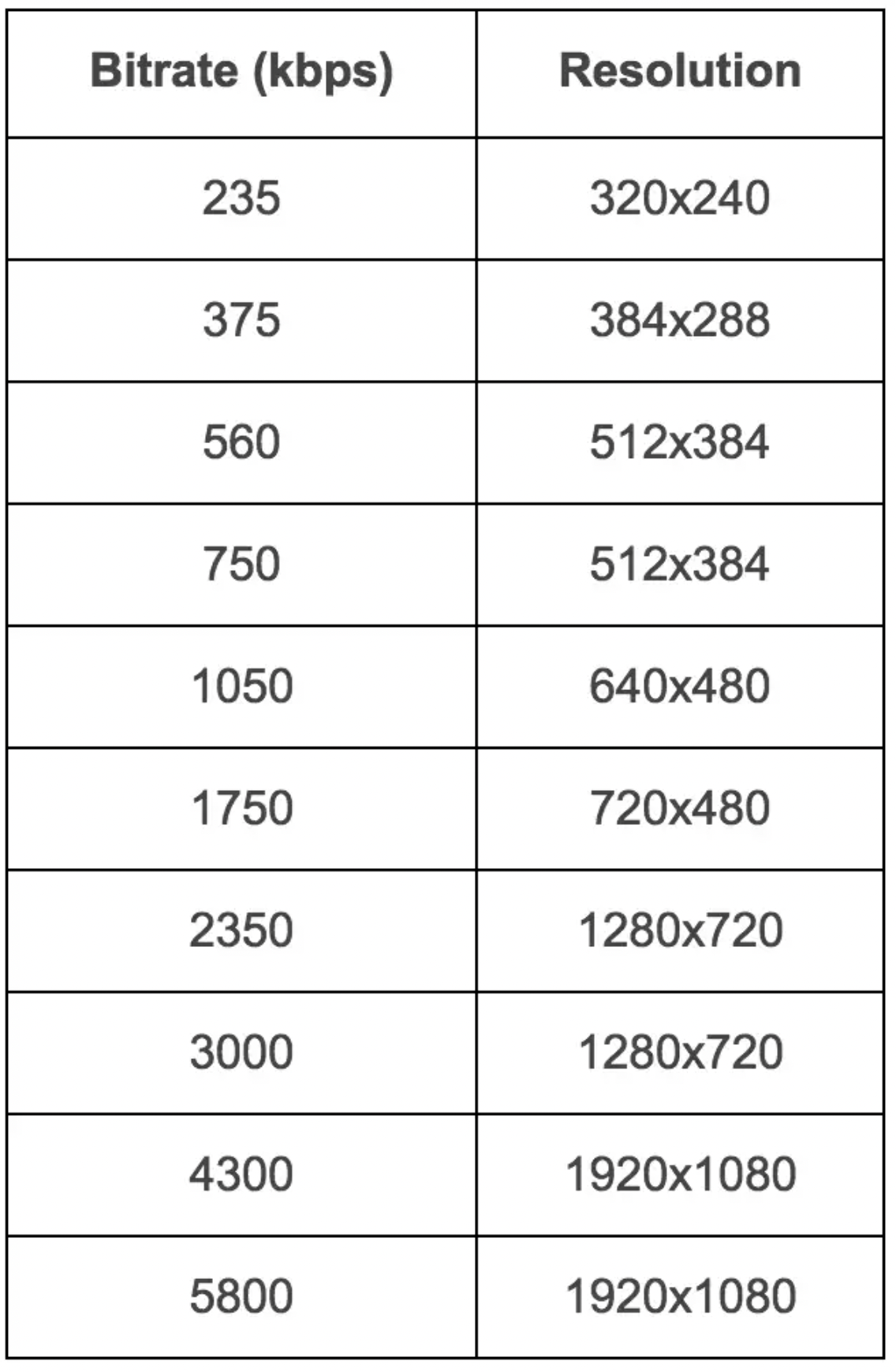 위의 표를 해석하면 320x240 resolution으로 encoding하기에는 235 kbps bitrate면 충분하다라는 의미입니다. 위 표처럼 resolution에 따라 bitrate가 정해진 표를 fixed bitrate ladder라고 합니다.