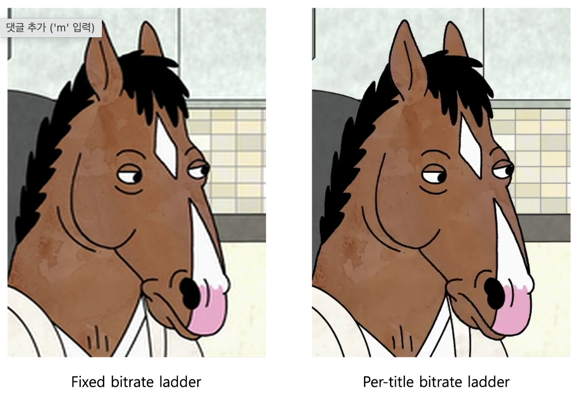 Animation이라는 title을 가진 동영상의 경우 대부분 content가 simple합니다. Simple하다는 것은 flat region이 많으며 frame사이의 minimal한 motion만 존재한다는 뜻입니다. 이러한 특성때문에 animation이라는 title을 가진 동영상은 low bitrate를 가져도 visual quality(e.g. PSNR, VMAF)가 크게 낮아지지 않습니다. 그래서 title마다 성격을 고려하여 bitrate ladder를 구성하는 것이 per-title encoding입니다.