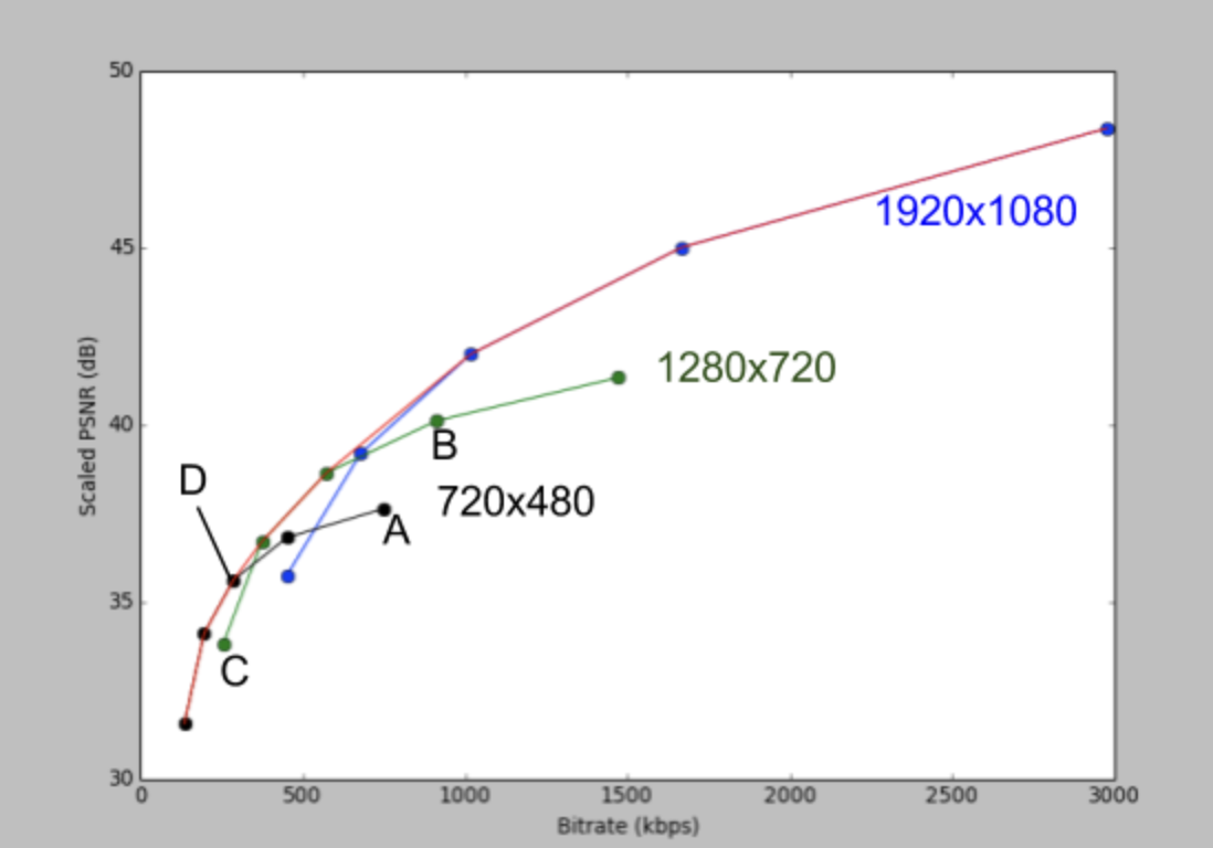 PSNR과 bitrate의 trade off관계를 봤을때 위 사진의 빨간색 커브에 속하는 점들이 optimal encoding configuration이고 A, B점은 sub-optimal한 점들입니다. (위 그래프의 한정으로) 1920x1080 resolution으로 높은 range의 bitrate(1500~3000kbps)에 대해 encoding할 경우 optimal하지만 낮은 range의 bitrate(0~1000kbps)에 대해서는 1280x720이나 720x480 resolution이 optimal한 점입니다.