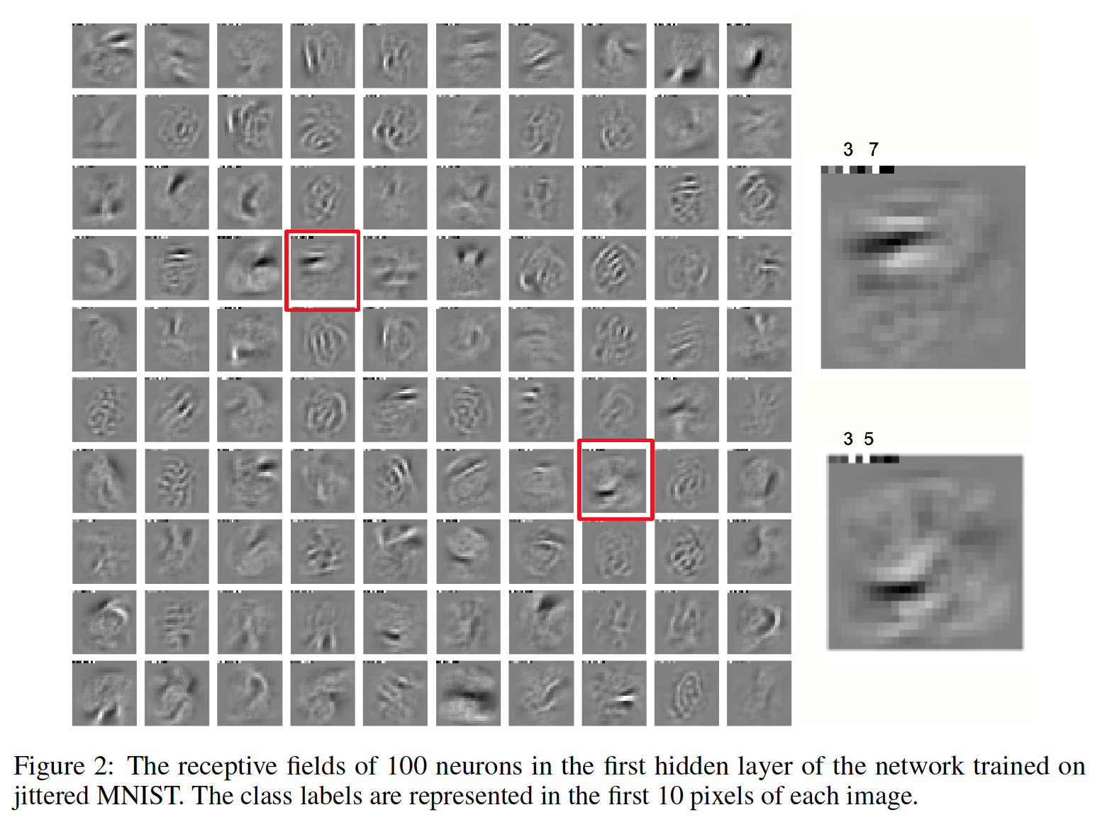 그리고 흥미로운 결과로는 first hidden layer의 recpetive field를 보았을 때 아래와 같이 image의 첫 10 pixels에서 class label이 학습되는 것을 볼수 있습니다.