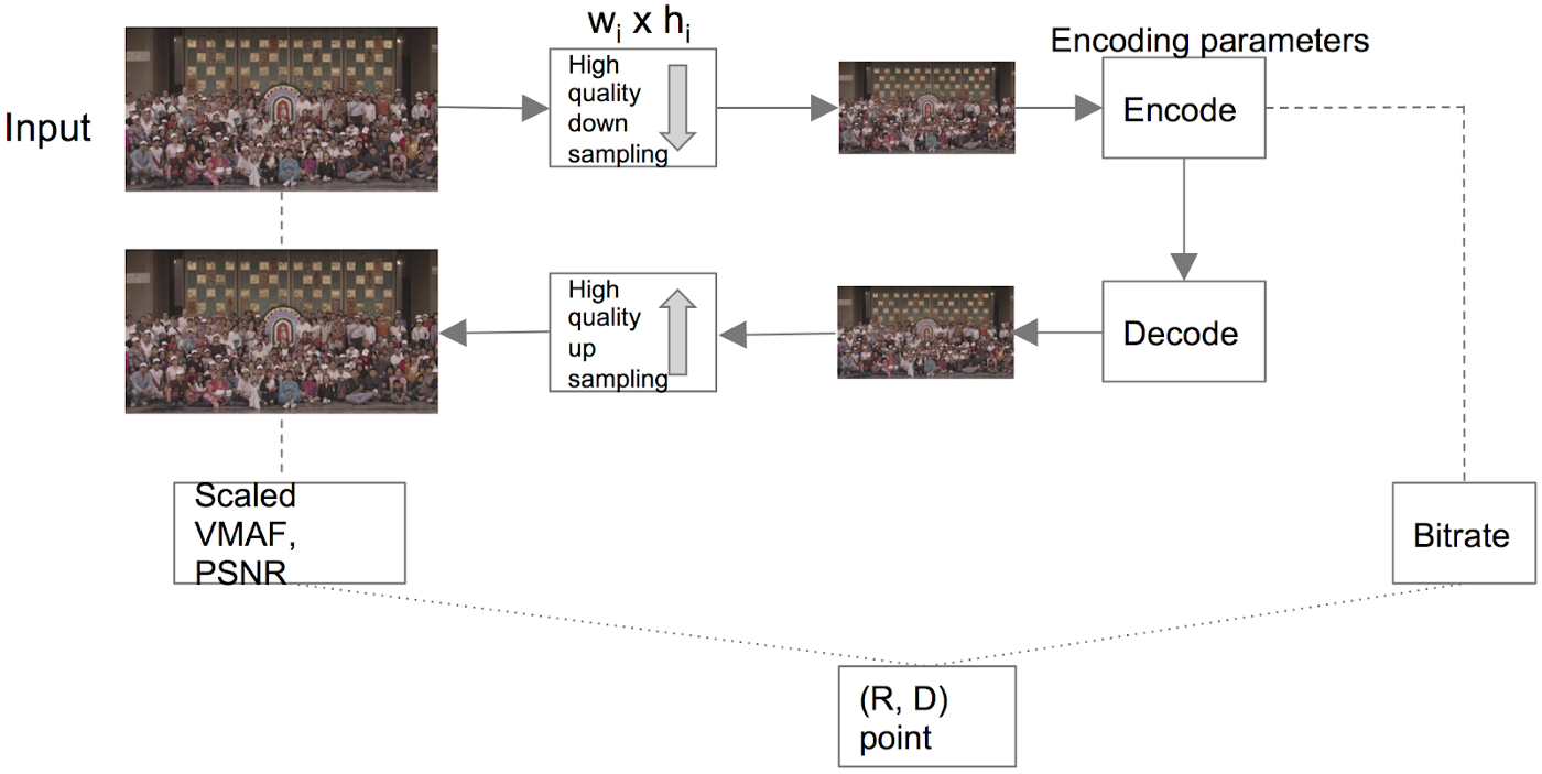 각 shot에 대해서 여러 CRF와 Resolution 값에 대해 모두 encoding합니다. CRF값과 resolution의 값이 정확히 어떤 범위 및 값인지는 확인할 수는 없지만 해당 Netflix 논문을 참고했을 때 CRF는 16, 20, 24, 28, 32, 36, 40, 44, 48이고 resolution은 1080p, 720p, 540p, 432p, 360p, 270p, 216p를 사용하였습니다.