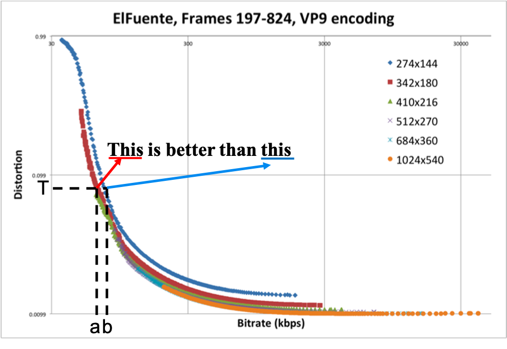 위 그래프는 하나의 예시이지만 거의 대부분 shot에 대해서 convex hull모양의 R-D rate 그래프를 얻을 것입니다. 그럴 경우 Distortion T값을 기준으로 했을 때 a값을 가지는 180p가 b값을 가지는 144p보다 bitrate가 더 작은 것을 확인가능합니다. 즉, convex hull에 포함되는 point들이 특정 bitrate에서 가장 distortion이 낮은 것을 의미하고 또한 특정 distortion에서 가장 bitrate가 낮은 것을 의미합니다.