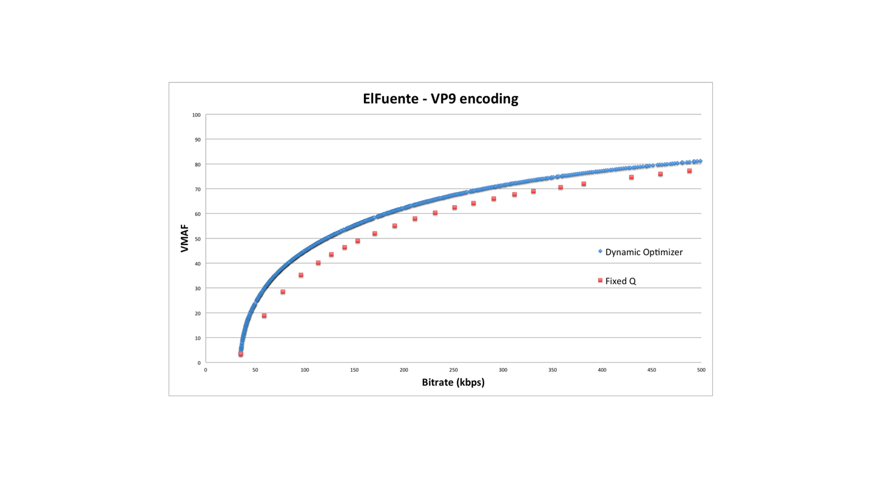 Conventional encoding(Fixed Q)과 비교했을 때 per-shot encoding(Dynamic Optimizer)의 성능은 아래와 같다고 합니다. 같은 distortion기준으로 per-shot encoding의 bitrate가 15~20%정도 적은 것을 확인가능합니다. 굳!