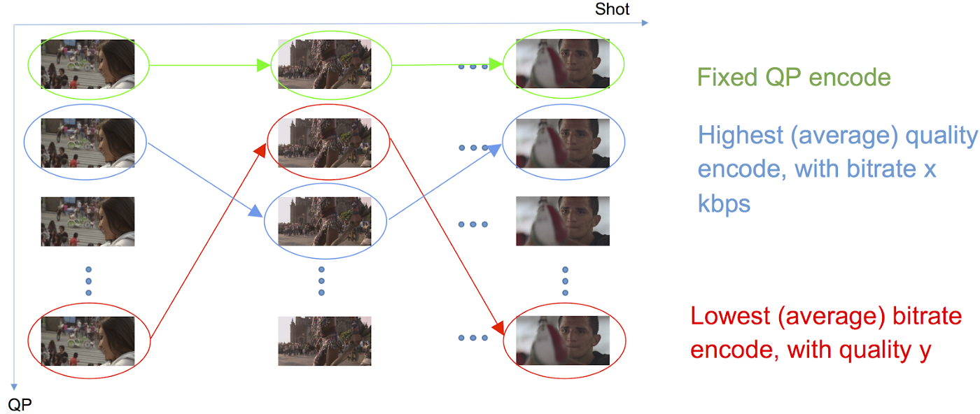 위 그림처럼 constraint를 bitrate로 주었을 때는 파란색 경로를 따라 평균 visual quality가 가장 높도록(distortion이 낮도록) 각 encoded shot들이 선택된 것을 볼 수 있지만 반대로 constraint를 visual quality로 주었을 때 빨간색 경로를 따라 평균 bitrate가 가장 낮도록 encoded shot들이 선택된 것을 볼 수 있다.