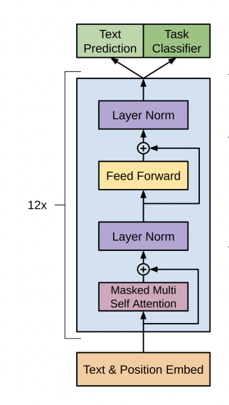 - Masked self-attention heads(768 dim and 12 attentions heads)가 포함된 12 layers