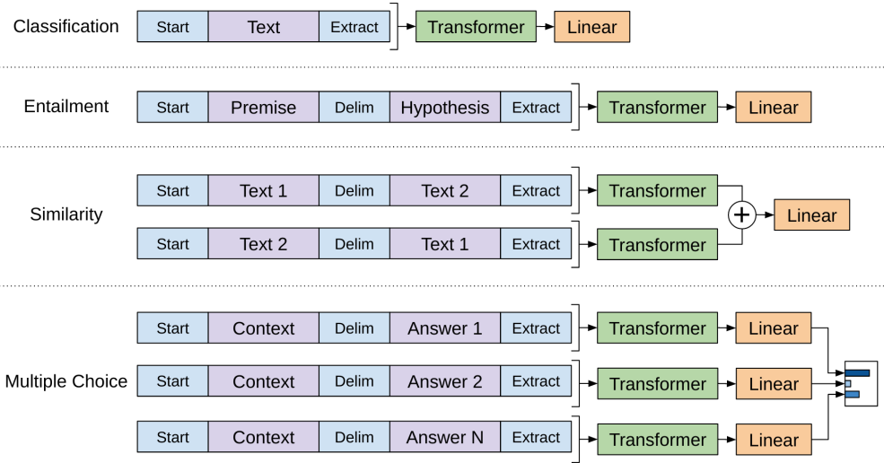 아래 그림과 같이 다양한 task의 입력을 start token, delimiter(문장 구분), end tokens(Extract)으로 이루어지도록 하는 것. 이를 통해 모델의 최소한의 변경만으로 효과적인 fine-tuning가능함