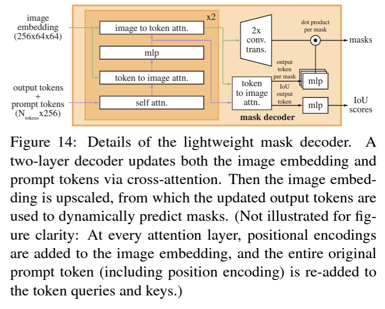 Mask decoder의 역할은 image embedding, prompt embedding과 output token을 효과적으로 segmentation mask에 mapping하는 것입니다. Mask decoder는 transformer decoder block과 dynamic mask prediction head를 사용하였습니다. 해당 decoder block은 전체 embedding을 update하기위해 prompt self-attention과 cross-attention을 2가지 방향으로 사용하였습니다. ([1] prompt-to-image, [2] image-to-prompt embeddings) 아래와 그림과 같이 2개의 blocks이후에는 image embedding을 upsampling하고 MLP는 output token을 dynamic linear classifier에 mapping하게 됩니다. 그리고 각 image location에 대해 mask foreground probability를 계산합니다.