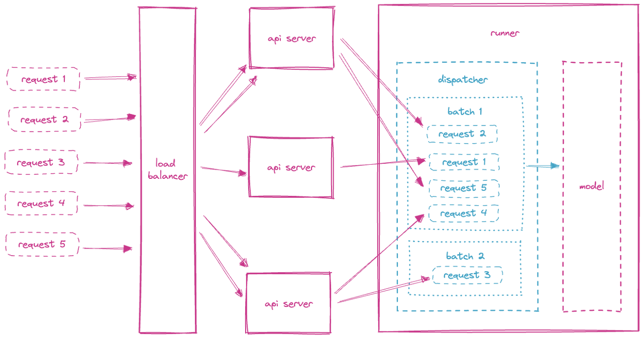 bentoml.pytorch.get함수를 사용하였습니다. 그리고to_runner함수를 통해 모델을 실행(inference)할 수 있는 하나의 computation unit로 만듦- Runner는 remote python worker에서 실행되며 scaling기능을 가지고 있음