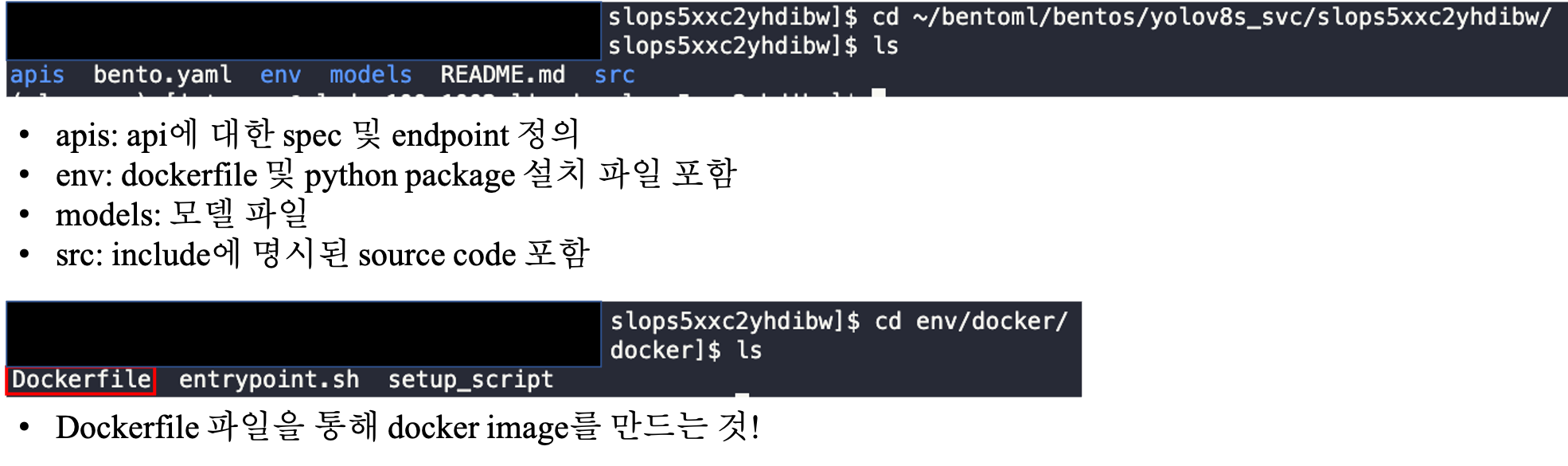 Log를 보면 model store에 저장된 yolov8s_model:ukgv3lhwxstqdibw를 load하여 packing하는 것을 알 수 있고 service:svc에서 정의한 service 이름인 yolov8s_model을 기반으로 tag(slops5xxc2yhdibw)도 생성되었음을 알 수 있습니다. 위의 과정을 통해 무엇이 생성되었는 지 알려드리기 위해 ~/bentoml/bentos/yolov8s_svc/slops5xxc2yhdibw/ (~/bentoml/bentos/${SERVICE_NAME}/${SERVICE_TAG}) 디렉토리로 가봅니다.