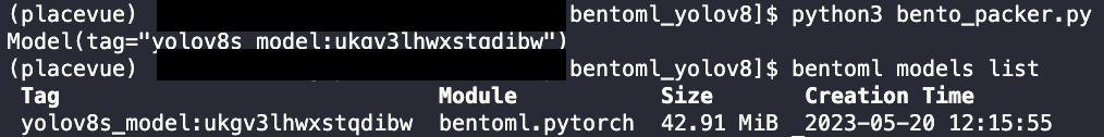 위 파일을 실행시키면 아래와 같이 정상적으로 model saving되는 것을 확인가능합니다. Tag부분을 보면 docker에 image_name:tag와 똑같이 model_name:tag(yolov8s_model:ukgv3lhwxstqdibw)형태로 저장됩니다. 그리고 bentoml models list cli를 통해 저장된 model size나 생성 시간 등을 확인가능합니다.