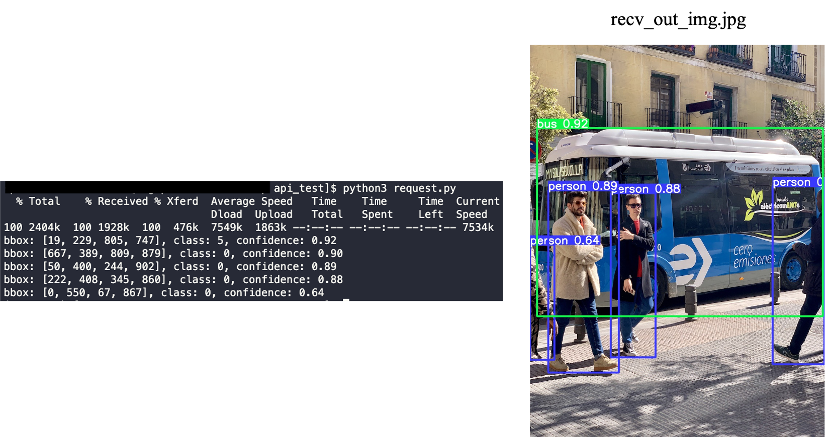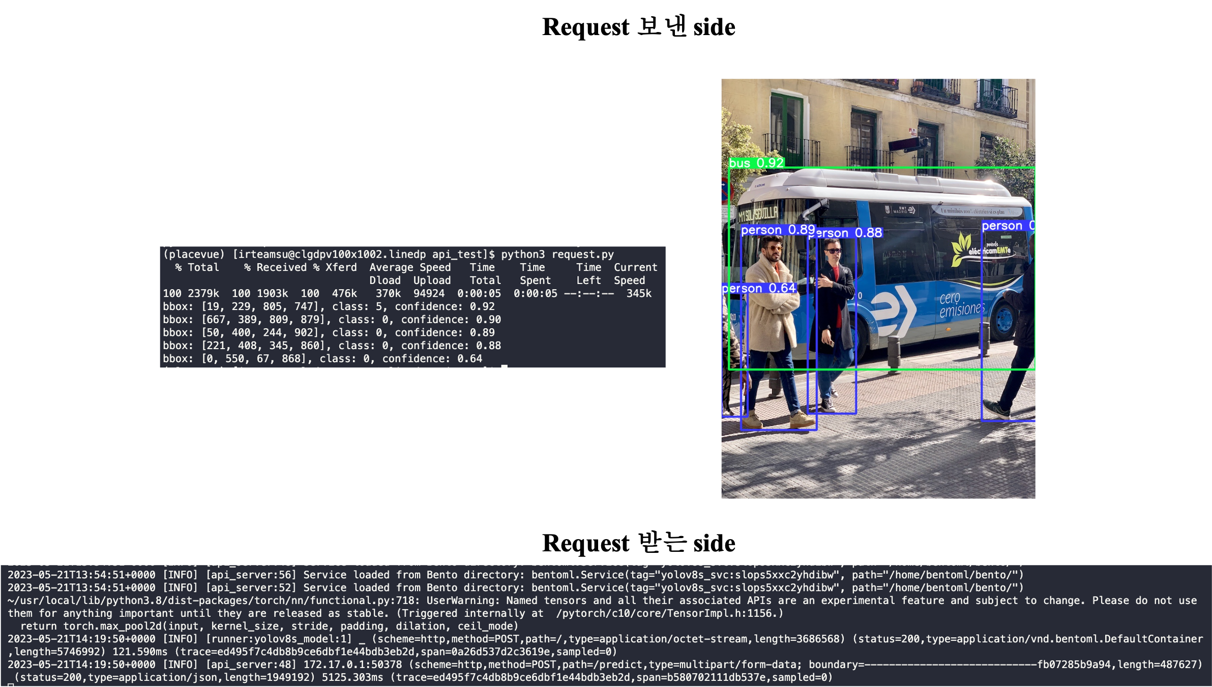 위와 같이 정상적으로 predict api에 image가 post되어 YOLOv8s모델을 통해 detection 된 결과를 받을 수 있습니다. 왼쪽 log에는 detection result info을, 오른쪽 사진은 detection result image를 나타내었습니다. (Class 0은 person, class 5은 bus를 의미합니다.)