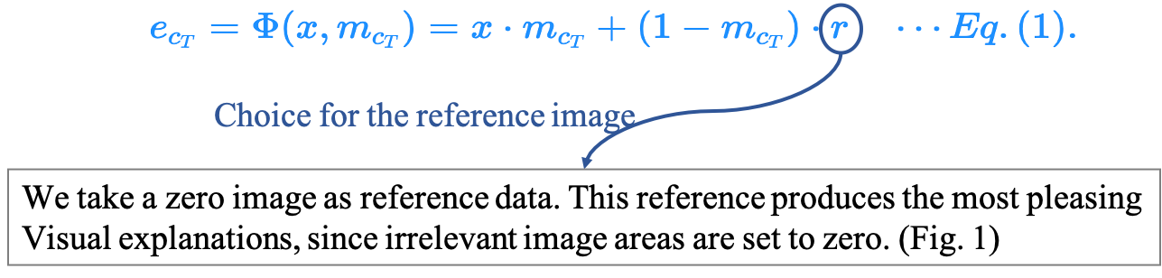 Using the mask based definition of an explanation with a reference (\(r=0) \) as well as similarity metric, a preserving explanation can be computed by: